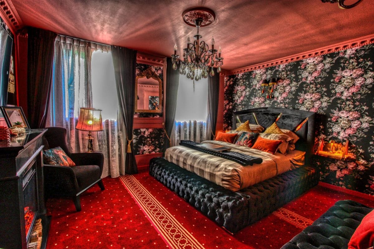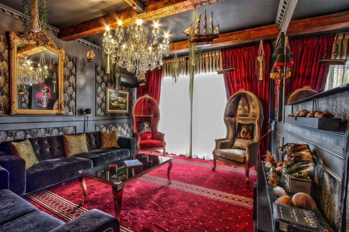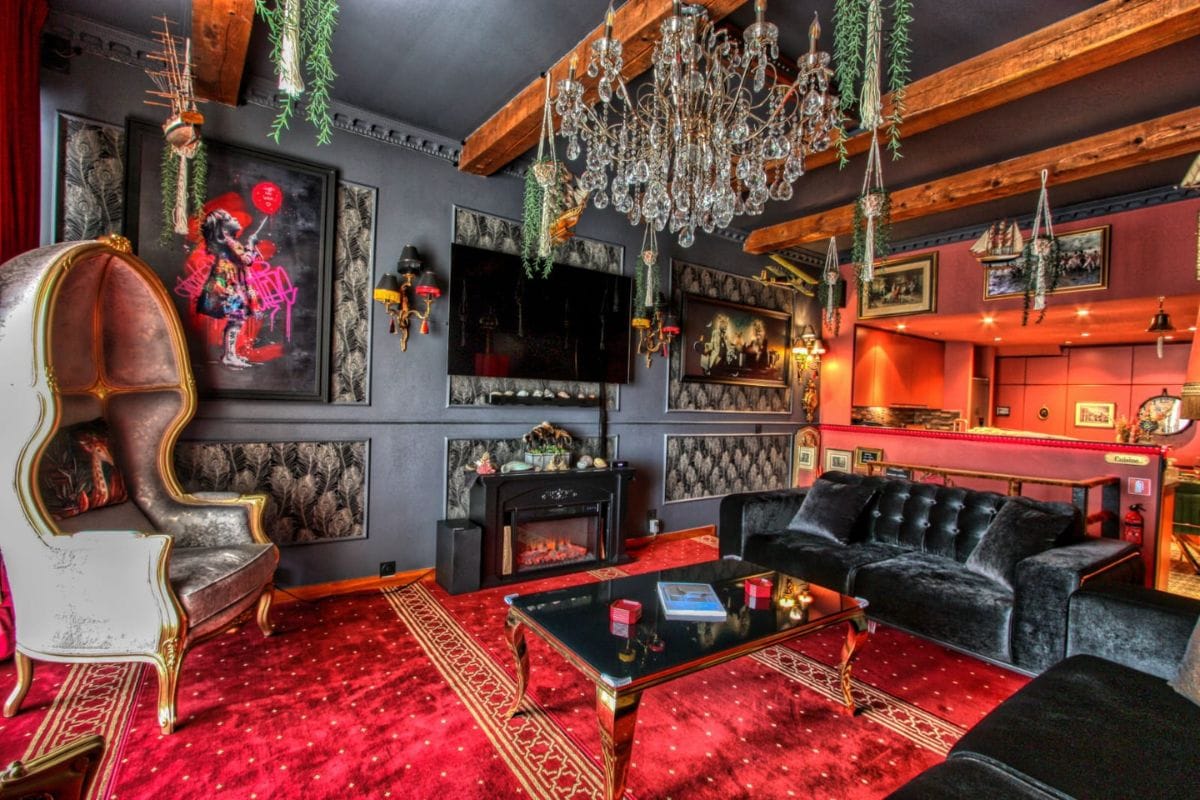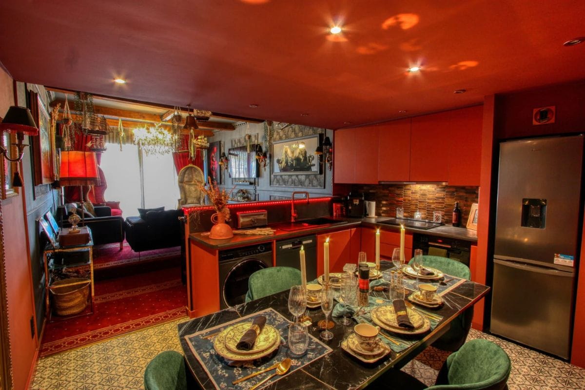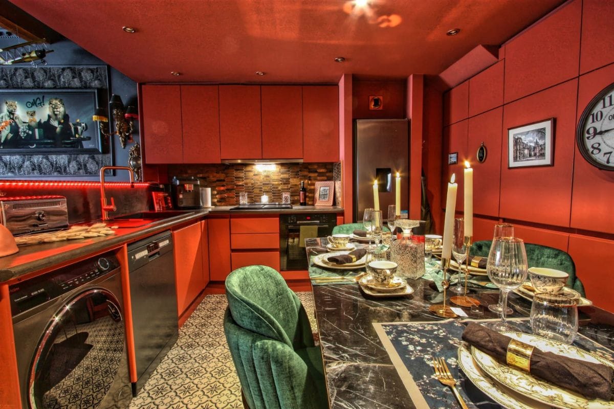 Spanning approximately 102 m², the apartment is designed with a distinctive artistic style, blending bold interiors with refined details. The spacious living area features elegant furnishings, a fireplace, and a stylish lounge atmosphere, while the fully equipped open-plan kitchen and dining space provide a comfortable setting for both everyday living and entertaining. The property includes two bedrooms and two bathrooms, each thoughtfully designed to offer both comfort and privacy.